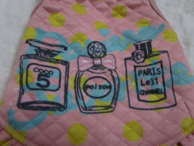 キュートな水玉柄のボディに香水瓶モチーフと手描きロゴのプリント