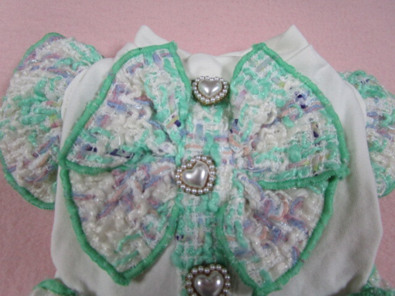 背中部分のフェイクボタンはハート型のパールとゴールドの