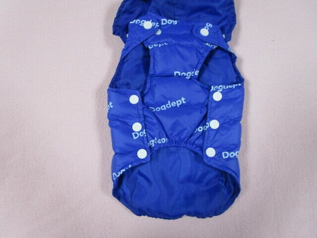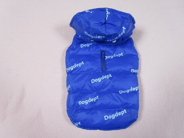 DOG DEPT ドッグデプト Sサイズ 胴回り41~44㎝ ロゴ入り フード付きダウンベスト ブルー 中古
