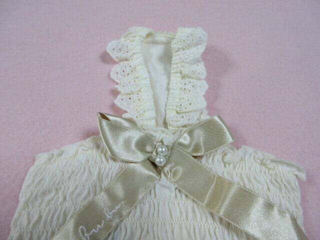 肩ひもはコットンレースにゴム入り、胸周りは大胆にシャーリングステッチを入れフィット感あるシルエット